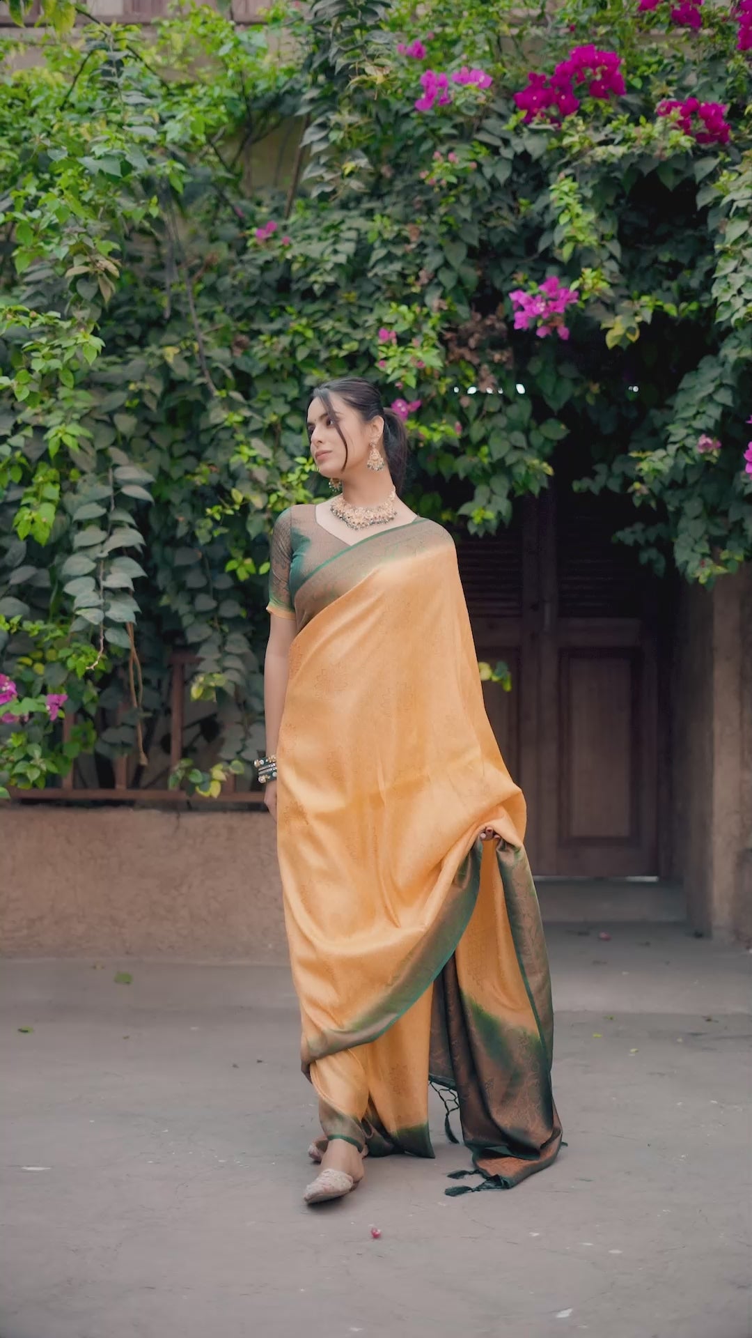Add royal elegance to your collection with this Gold Banarasi Silk Saree, crafted with traditional weaving and a luxurious shimmering finish.
