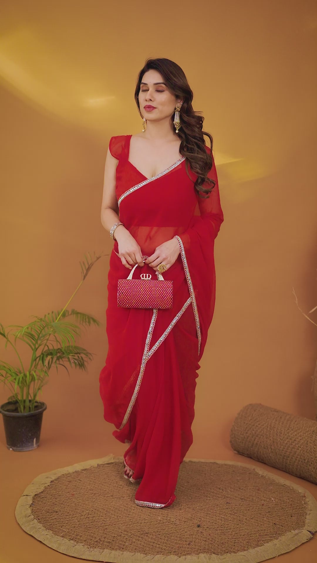 This Red Solid Georgette Saree features a radiant mirror border that adds glamour to your festive appearance. The matching blouse complements the saree perfectly, creating a complete outfit.